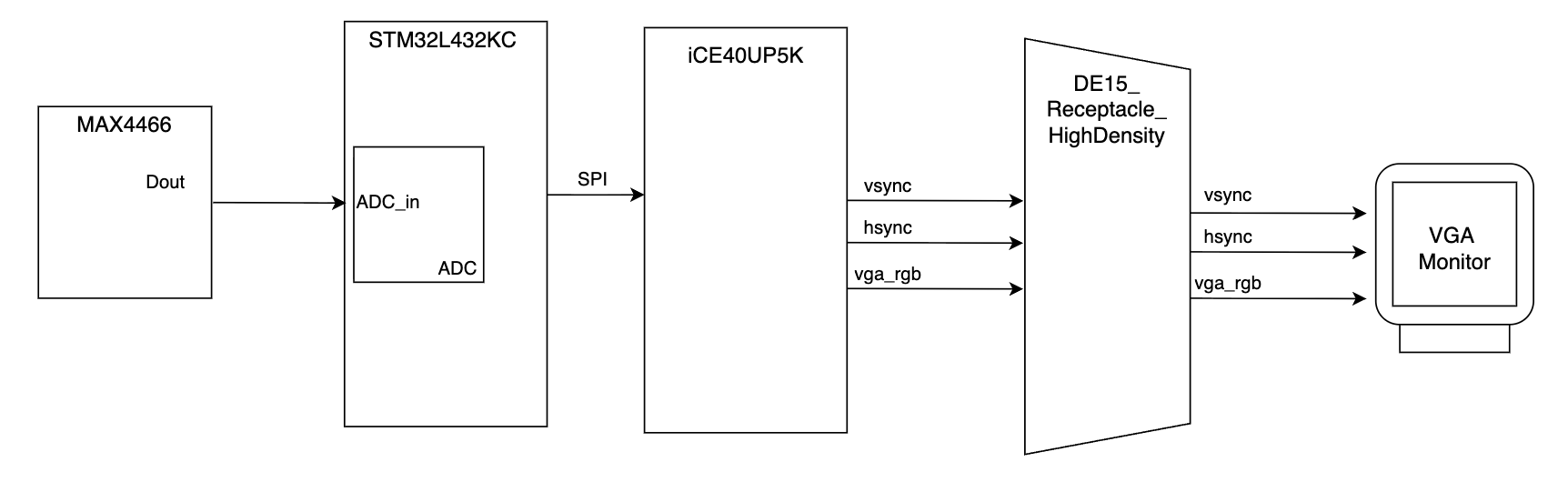 The system block diagram shows the flow of our design, starting with an input from a microphone which is sampled by the MCU’s internal ADC. The MCU’s ADC output is sent over to the FPGA using SPI. The music score and notes are output from FPGA to the VGA monitor.