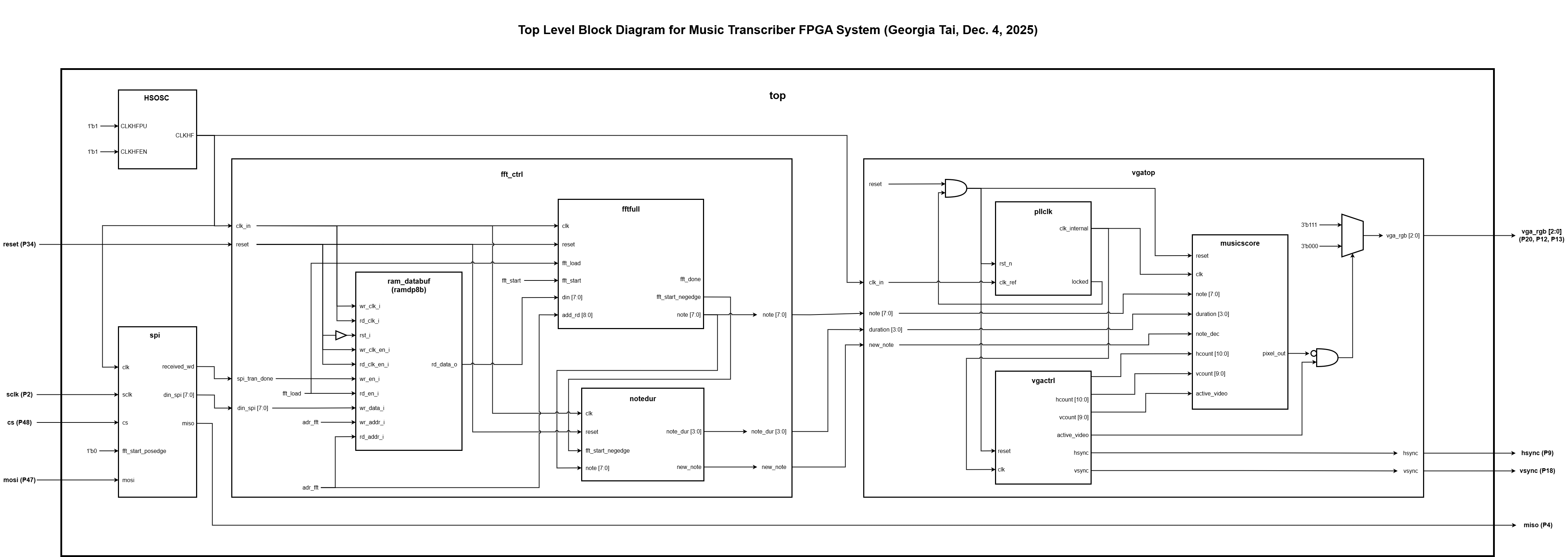 The FPGA was in charge of processing the inputs sampled my the MCU using a 512 point FFT to extract the dominant frequency of each sample as well as displaying the detected notes on a musical score through VGA. The frequency outputs of the FFT was used to decode the corresponding note and duration of each sound input. The note and duration was then passed into the VGA module, which has a pixel resolution of 1024 x 600 and a refresh rate of 60z.