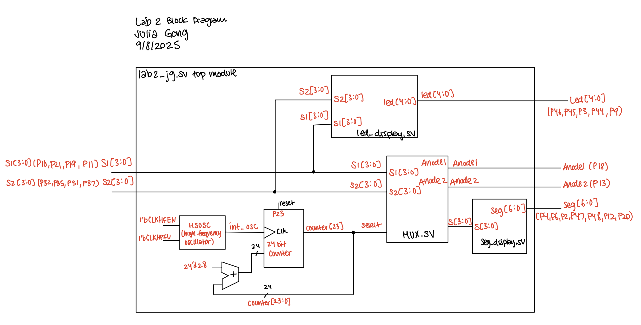 The block diagram below depicts how the input and internal signals are connected among the modules to produce the 7-segment display and LED outputs.