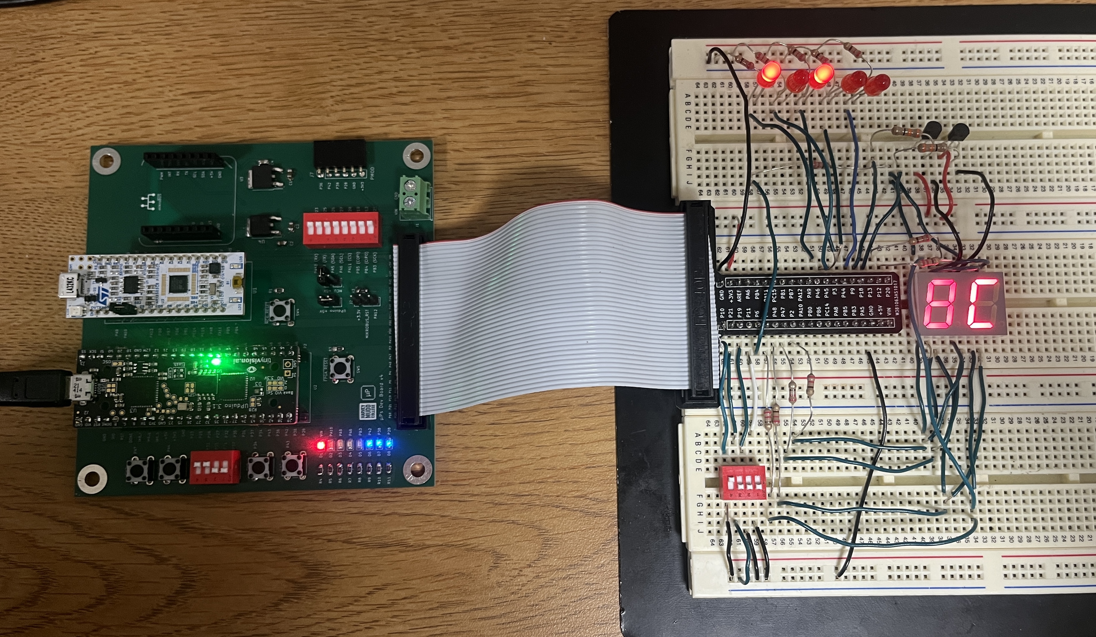 The components of this lab consisted of the development board, a dual 7-segment display, 5 LEDs, two 2N3906 PNP transistors, and a DIP switch.