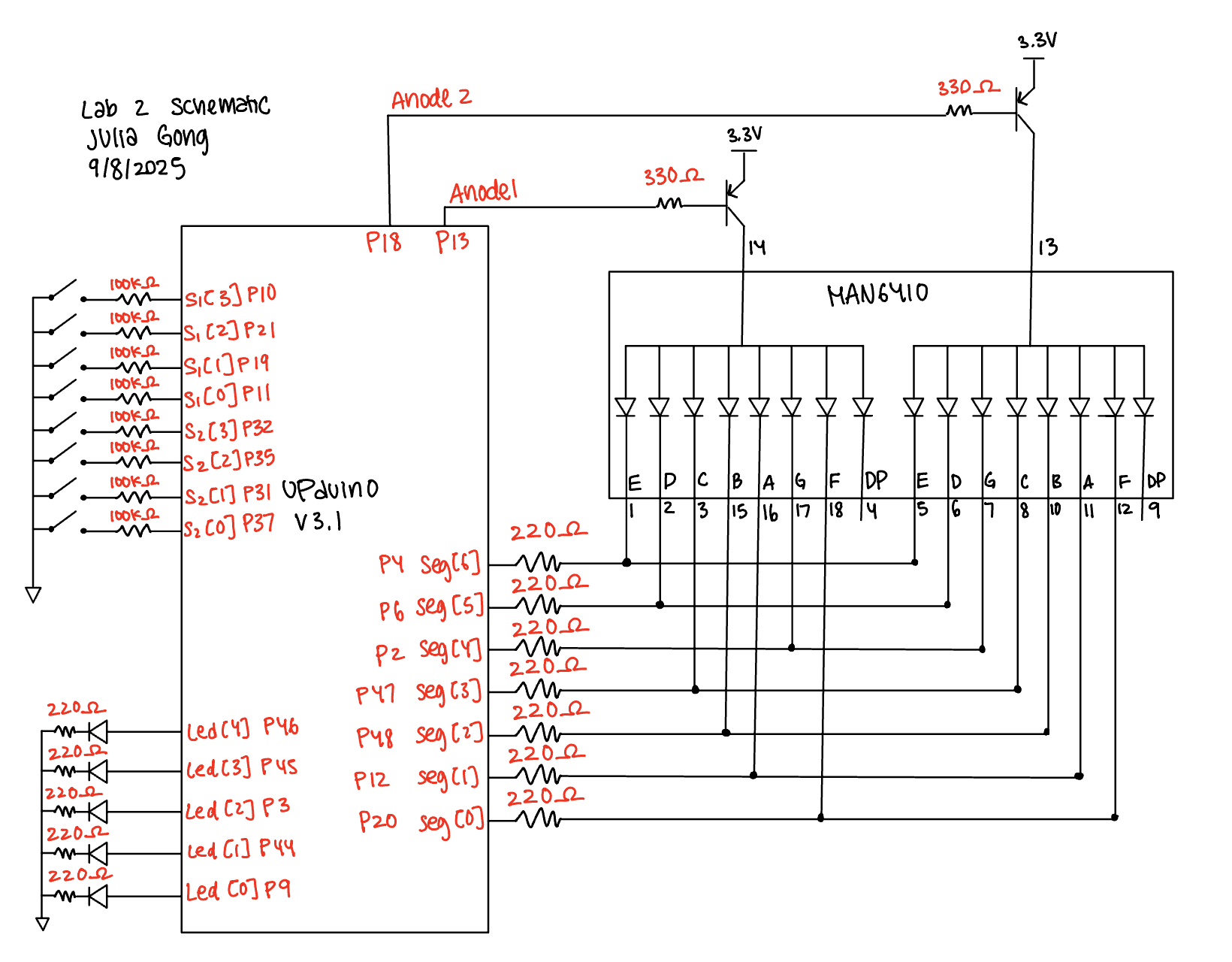 When implementing the design onto the breadboard, 220Ω resistors were used to draw current from each segment of the dual 7-segment display. Since there was a PNP transistor connected to the anodes, there is a Vceast of 200mV. Additionally, there is a voltage drop from the LED segment of 1.8V. Using V = IR, (3.3V - 0.2V - 1.8V)/10mA = R, where R = 130Ω.