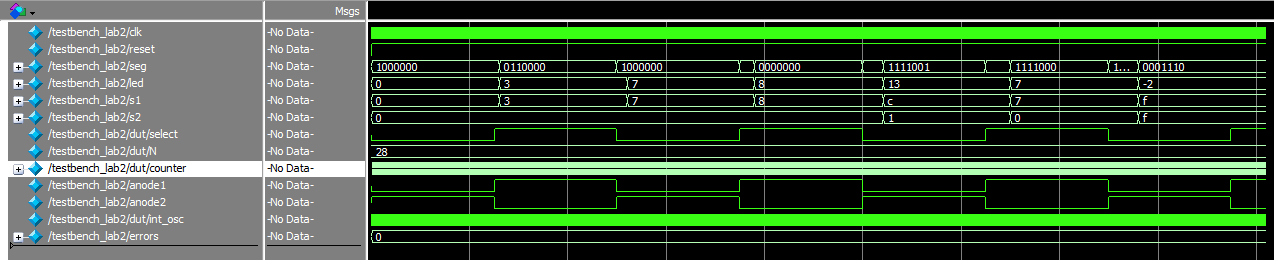 The waveforms for the top module show that the values for anode1 and anode2 are toggling in response to the counter/select value at the correct frequency. As a result the simulation results indicate that the proper segment output is chosen.
