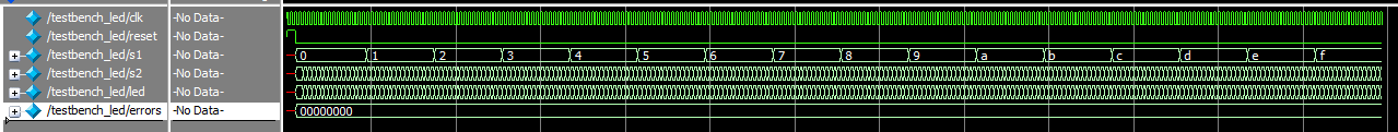 The waveforms from the led module show that the sum of the inputs s1[3:0] and s2[3:0] are properly summed and assigned to each bit of the LED display.