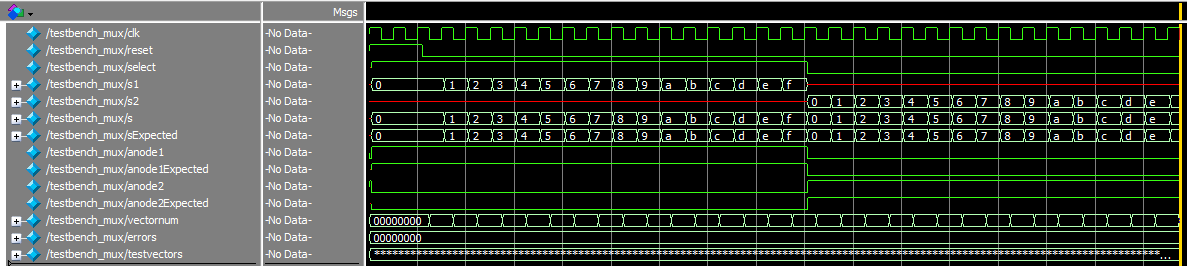 The waveforms from the mux module simulation show that the mux is choosing the proper values for s[3:0], anode1, and anode2.