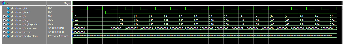 The waveforms for the 7-segment display verify that the proper pattern of segments are lit up in response to the 4-bit input.
