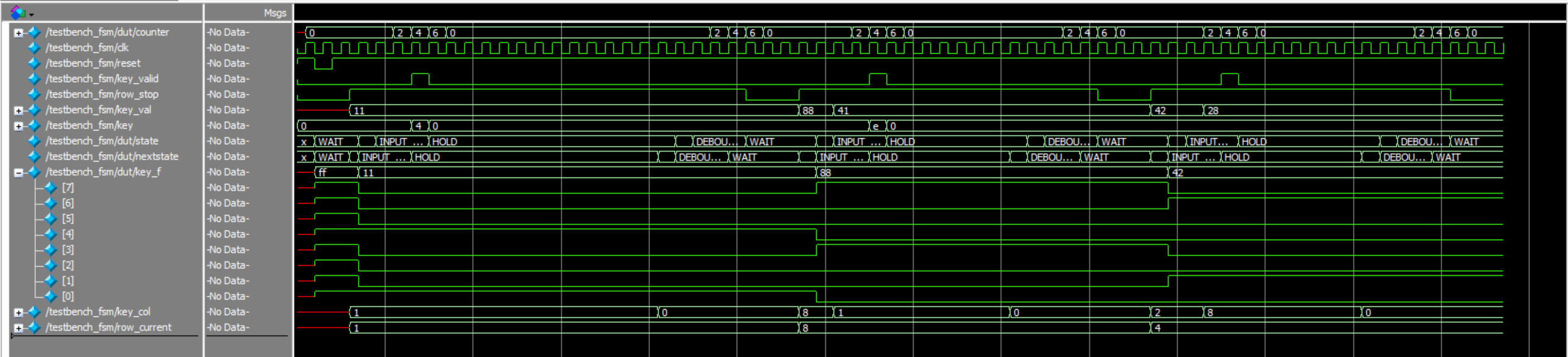 The waveforms for the fsm shows that when the module receives a column input, it is properly cycling through the states of the finite state machine.