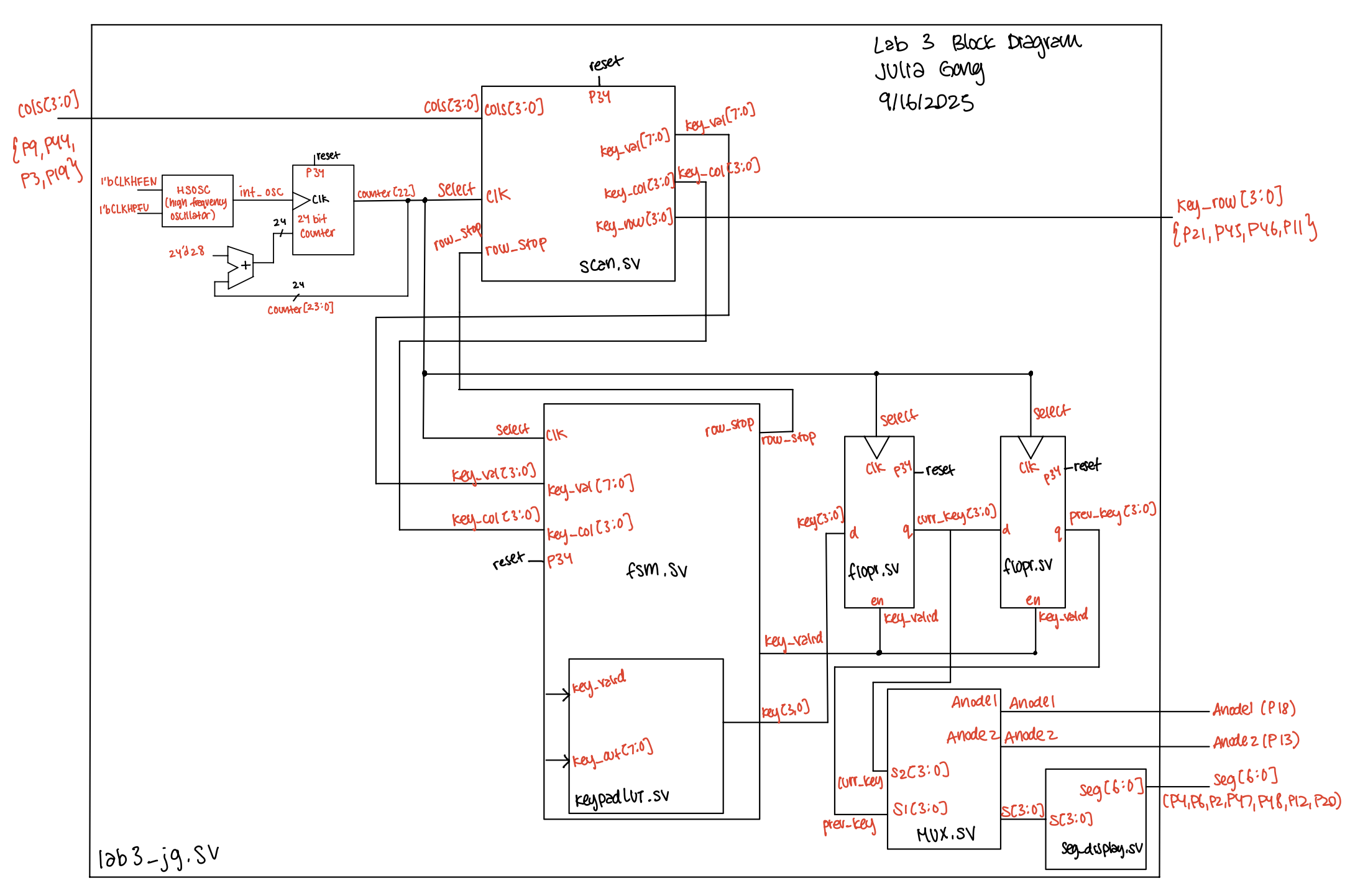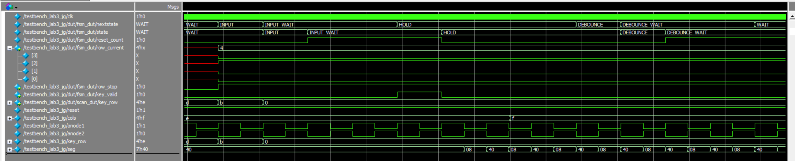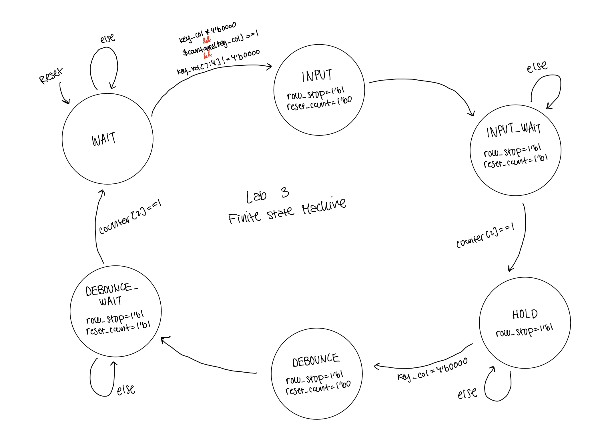 In this lab I designed an FSM in order to debounce the keyboard properly. The focus of this lab was to design synchronous sequential logic, which made me aware of synchronizing my column inputs as well as keeping track of what clock cycles specific values update at.