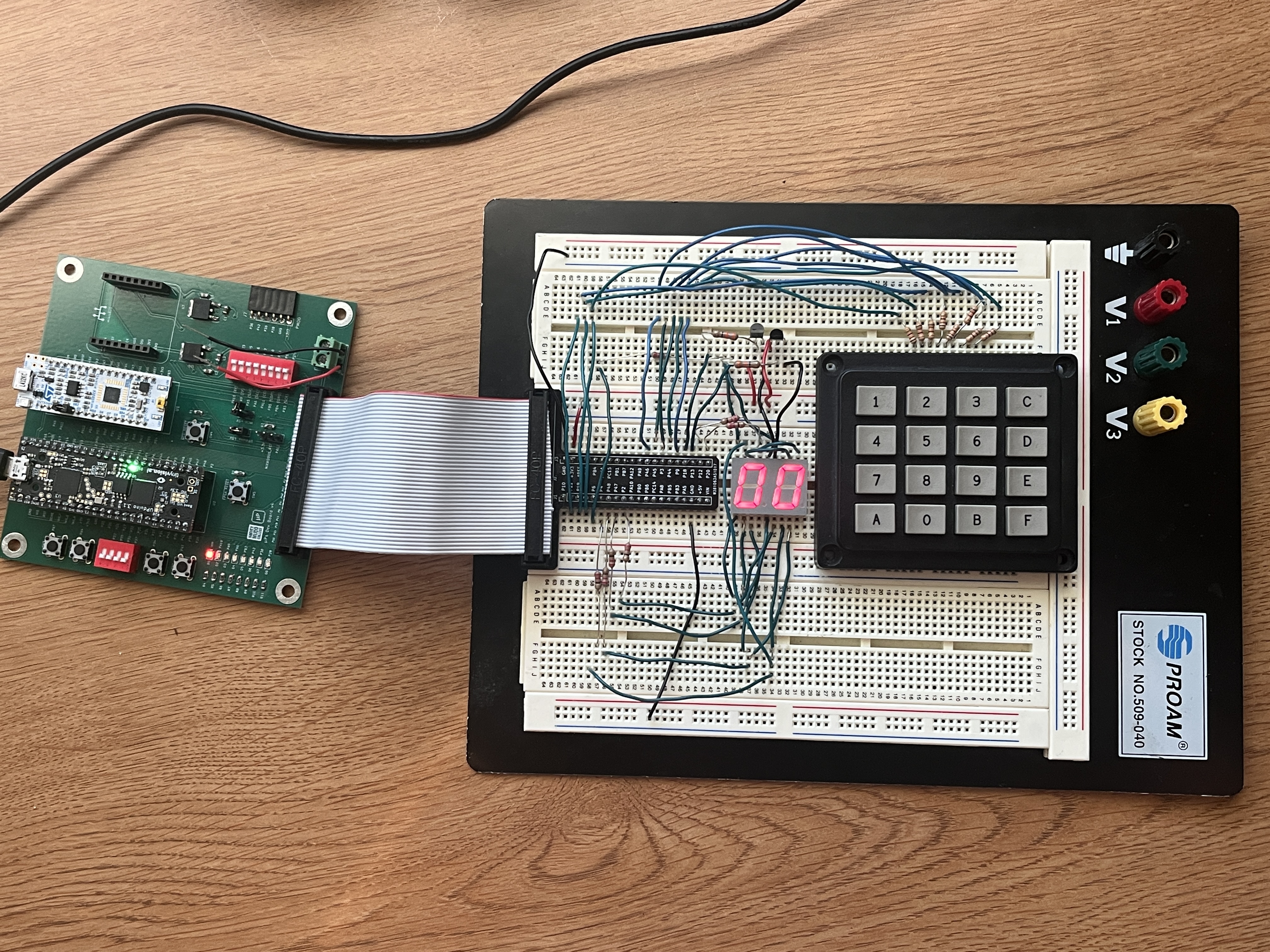 The dual 7-segment display responds properly to the keypad inputs. When multiple keys are pressed at once it registers the key pressed first and does not lock up. Additionally, when one key is held down and other keys are held down, the other inputs are ignored. The functioning system can be seen below!