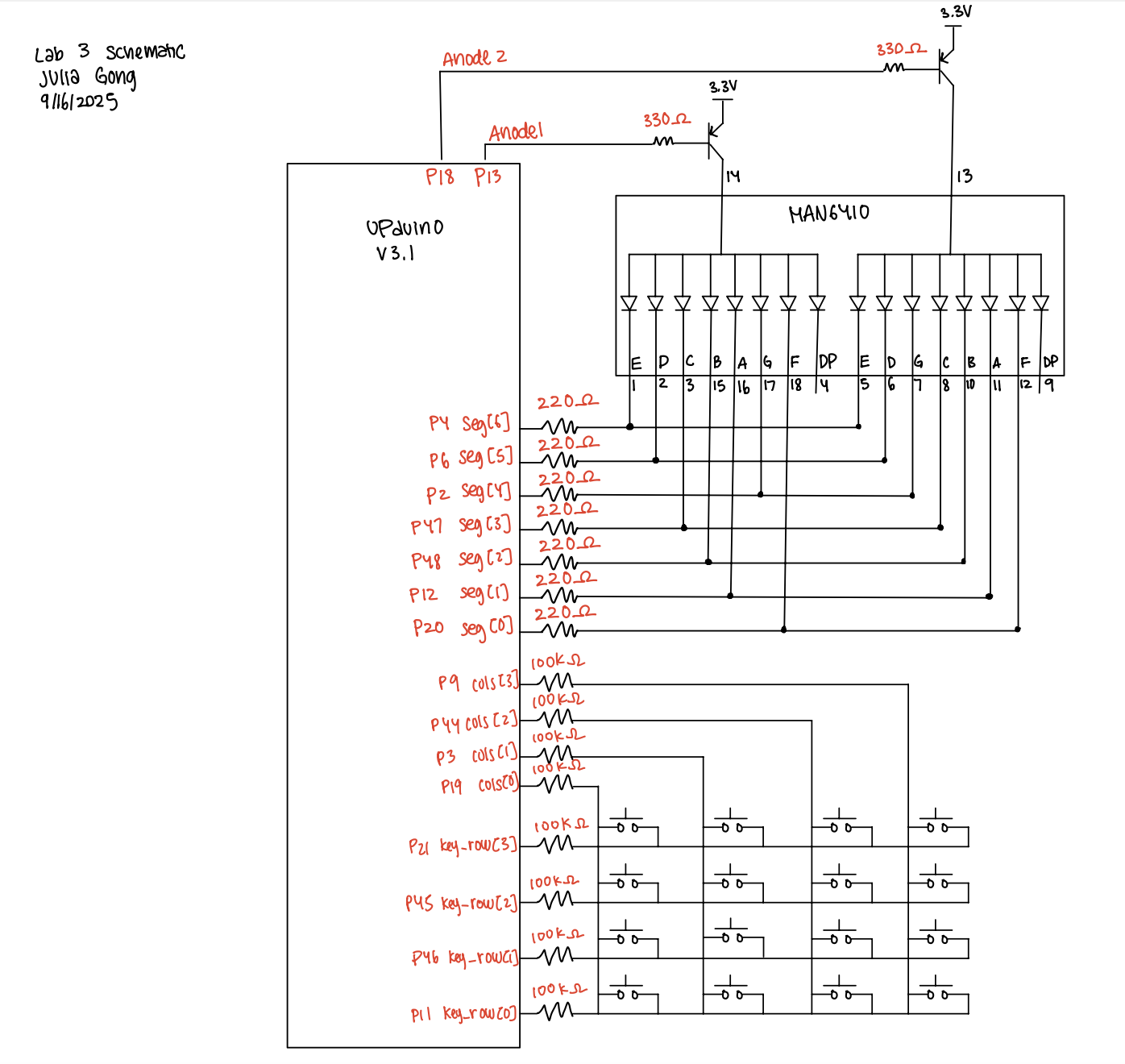 The components of this lab consisted of the development board, a 4x4 keypad, a dual 7-segment display, two 2N3906 PNP transistors. The keyboard schematic can be found here.