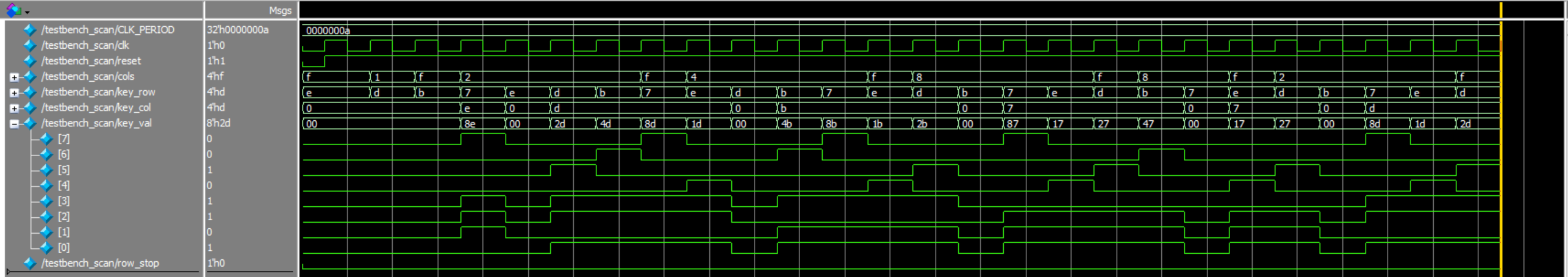 The waveforms for the scanner shows that the rows are changing, “scanning the keyboard”, in order to detect an input.