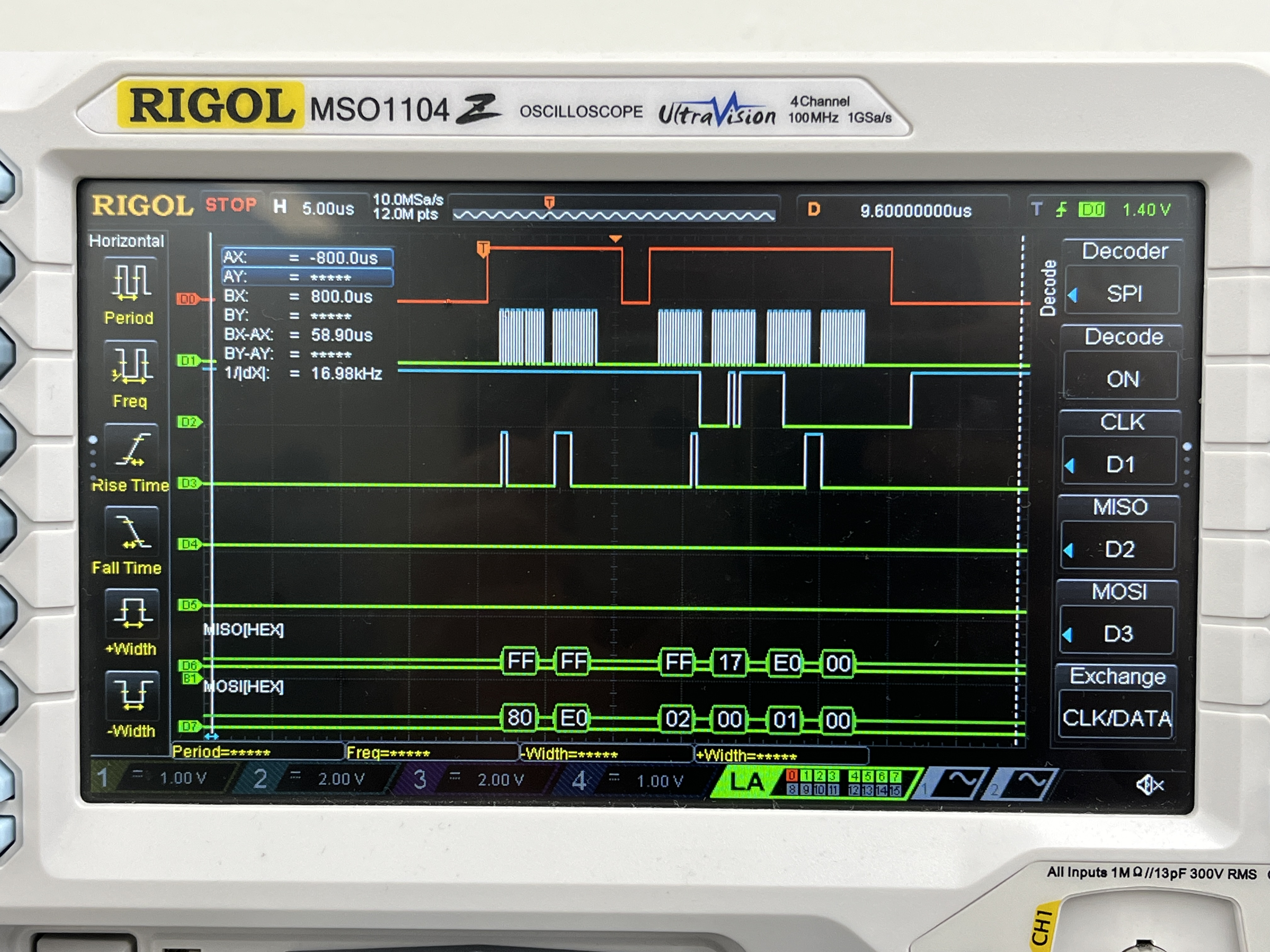 - D3 shows MOSI (microcontroller out, peripheral in)
